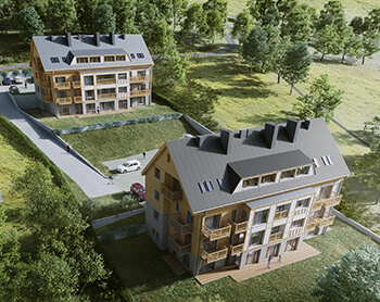 Dwa budynki zaprojektowane kaskadowo przez doświadczoną pracownię posiadają eleganckie elewacje, zgodne z regionalnym charakterem miejscowości. Powierzchnie i układy pomieszczeń zostały dopasowane do wymagań klientów. Z miejsca inwestycji rozciąga się spokojny widok na Sępią Górę i Izery.
